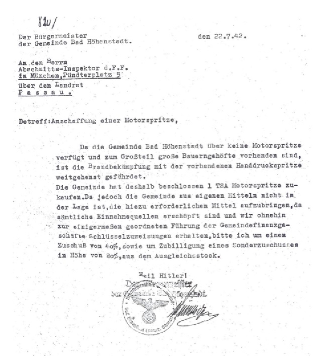 - 1942 | Die Gemeinde Bad Höhenstadt beantragt über den Landrat beim Abschnitts-Inspektor d.F.F. München die Anschaffung einer Motorspritze. Eine echte Sensation war für unsere Feuerwehr das erste Feuerwehrauto, der „Steyr-Daimler-Puch“, den wir aus den Beständen der Wehrmacht im Jahre 1946 bekommen haben.