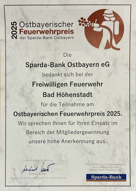 Die Freiwillige Feuerwehr Bad Höhenstadt wurde im Rahmen des Ostbayerischen Feuerwehrpreises 2025 von der Sparda-Bank Ostbayern eG für ihr Engagement in der Mitgliedergewinnung ausgezeichnet.